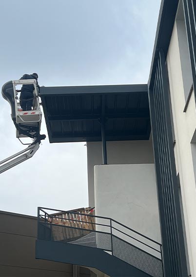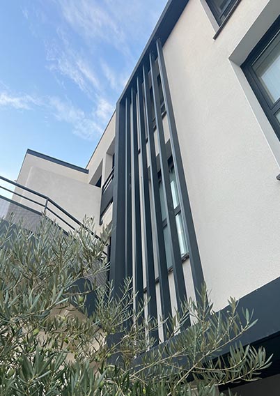 À cela s’ajoute la réalisation d’un auvent métallique au-dessus de l’escalier, avec un remplissage en bac acier thermolaqué double face.