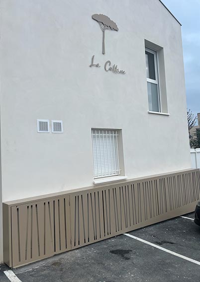 Nous avons également conçu des éléments décoratifs marquants, avec notamment un habillage autour des boîtes aux lettres intégrant une découpe laser du nom de la résidence, ainsi qu’un lettrage « LA COLLINE » implanté en façade accompagné d’une tôle découpée au laser représentant un pin. Une autre pièce, découpée au laser avec un motif bambou et intégrant un ouvrant, vient compléter cet ensemble harmonieux et personnalisé. Ce chantier met en lumière notre capacité à associer technicité, finitions soignées et travail du détail pour sublimer les projets résidentiels